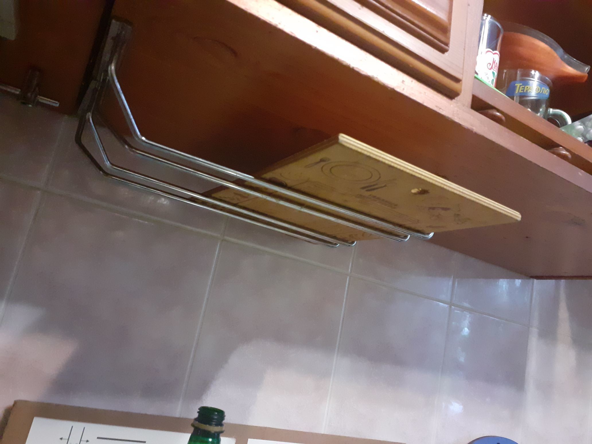 Комбинация обычной штанги и пары крючков — бюджетная альтернатива готовым рейлинговым системам. На такую конструкцию можно подвесить рулоны фольги, пищевой пленки, пергамента, а также бутылки с чистящими средствами, тряпки и резиновые перчатки. А если проявить фантазию, из крючков и штанги получится даже импровизированный карниз для коротких штор на кухне.