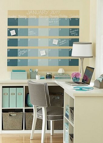 Организуйте рабочее пространство с помощью грифельного календаря или органайзера. На окрашенном участке стены можно ежедневно обновлять расписание, задачи и цели. Это не только практично, но и эстетично — ваш кабинет или домашний офис будет постоянно меняться, оставаясь уникальным. Для комфорта используйте беспыльный мел или специальные маркеры, чтобы избежать следов на полу.