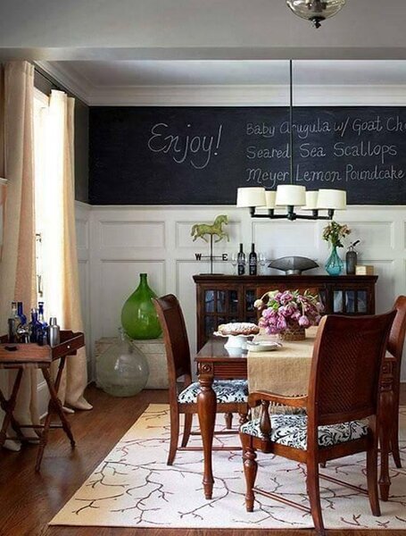 Используйте модный приём горизонтального разделения стен, комбинируя обычную и грифельную краску. Нижнюю часть стены на кухне или в столовой окрасьте грифельным составом — здесь можно записывать любимые рецепты, списки продуктов или меню на неделю. Даже если оставить этот участок пустым, тёмный цвет добавит интерьеру глубины, драматизма и уюта. Главное — соблюдать баланс оттенков в комнате.
