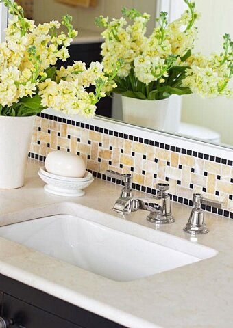 1. Добавьте мозаику. Недорогое решение, так как для его реализации Вам понадобиться небольшое количество мозаичной плитки. Использовав контрастную и яркую декоративную плитку над раковиной, во-первых, Вы защитите стены от воды (фартук), а во-вторых, придадите интересный штрих, не перегружая при этом пространство маленькой ванной.