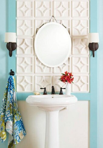 2. Привнесите текстуру. Объемная плитка как никогда сейчас популярна. Однако многие при декоре своего дома используют 3D плитку исключительно в прихожей, гостиной или спальне. Почему бы не применить её за зеркалом в Вашей ванной комнате? А чтобы добиться максимального эффекта воспользуйтесь яркой цветовой палитрой. Тем самым Вы добавите объема архитектурным деталям и элементам, а также украсите пространство в целом.