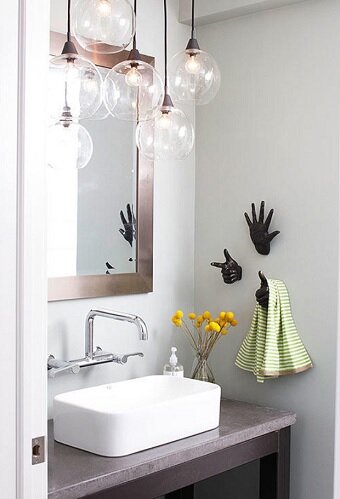 4. Добавьте уникальные штрихи. Освещение — это достаточно быстрое и простое решение для декора маленькой ванной комнаты. Поэтому добавьте индивидуальность с помощью оригинальных потолочных и настенных светильников, а также причудливых держателей для полотенец.