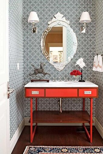 3. Попробуйте смелые узоры. Ванная комната - идеальное место для экспериментов с «вкусным» цветом или обоями с оригинальным рисунком. Единственное, чтобы сбалансировать, компенсировать и частично нейтрализовать такой вариант декора ванной комнаты необходимо привнести в интерьер большое количество светлых и белых акцентов (ванная, раковина, светильники).