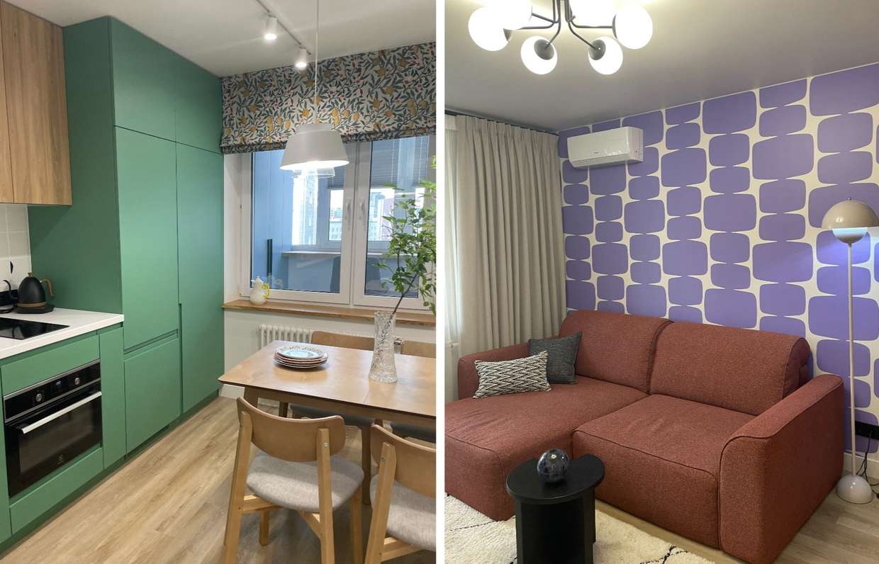 Иногда лучшее решение – не менять то, что уже хорошо работает. Исходная планировка сама по себе логична, поэтому её можно оставить практически без изменений. В небольших спальне и детской компактно разместятся кровать и шкаф, а самая большая комната (гостиная) станет многофункциональным пространством для отдыха и приёма гостей. На кухне был реализован небольшой, но эффективный приём: линейный гарнитур развернули к окну, а обеденный стол поставили напротив, создав уютную зону для приёма пищи. Даже ниши в прихожей нашли своё применение – в них удобно встроить системы хранения.