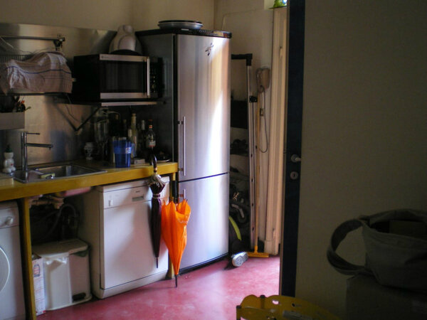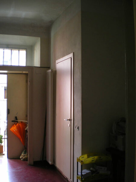 По сути здесь же, на кухне располагалась прихожая, которую всё же изолировали. Но места в выступающем кубе оказалось так мало, что даже для обувных полочек его не хватило.