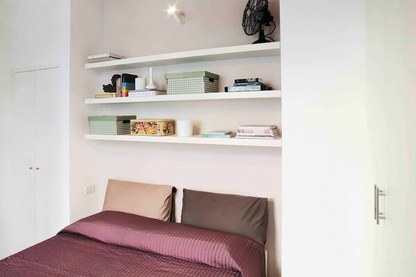 А в глубине квартиры осталось место для крохотной спальни площадью всего 9 кв. м. Выступ между дверью и нишей под стиральную машинку в коридоре на предыдущем фото – не что иное, как ниша для изголовья кровати со встроенными полочками. А шкаф во всю стену стоит через стенку от кухонного гарнитура – это дополнительная звукоизоляция от гостиной.