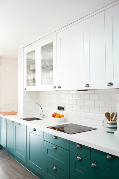 Конечно, вряд ли кто-то решится вручную самостоятельно преображать дорогой кухонный гарнитур из натурального дерева или с цементными фасадами. Но шкафы из МДФ вполне реально покрасить. Чтобы создать геометрический рисунок, пригодится малярный скотч. А самыми удобными и практичными считаются аэрозольные акриловые краски и автоэмали. Они тепло- и влагостойкие.