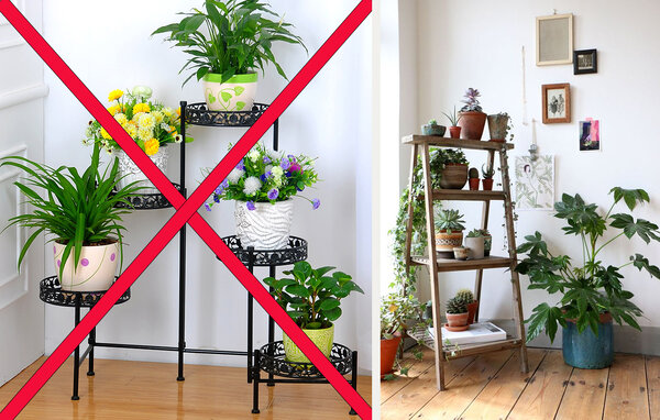 Мир так же постепенно уходит от разноуровневых систем для цветов. Стеллажи и "стремянки", полки и консоли приходят им на смену. Простые формы, подобранные в стиле остальной мебели.