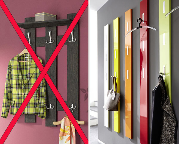 Традиционные крючки по-прежнему можно увидеть в продаже, им на смену приходят крючки-трансформеры. Их можно использовать в нужных местах и на нужной высоте или убрать из вида - оставить только декоративные панели. Впрочем, этим вариантом современные дизайнеры не ограничиваются. В продаже можно увидеть деревянные панели, которые трансформируются в панель с крючками и крючки в форме декоративных ручек.