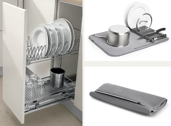 Многие уже оценили хранение посуды в нижних шкафчиках. Сюда аккуратно может поставить тарелку даже ребенок. И в качестве дополнения для тех, кто редко моет посуду руками - коврики для сушки посуды, которые можно свернуть.