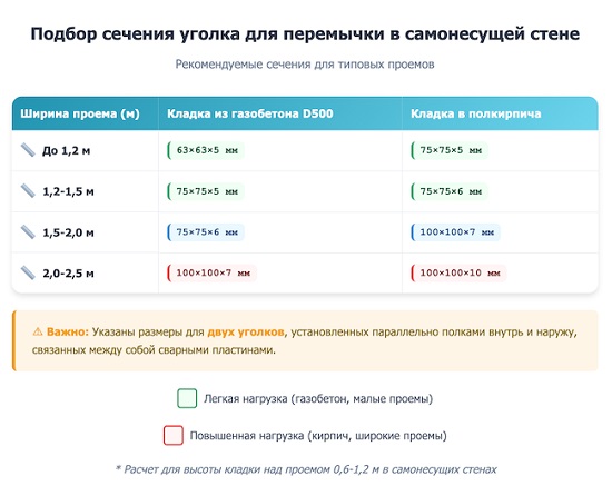 Правильный подбор сечения уголка критически важен для долговечности конструкции. Представленная таблица основана на расчетах для самонесущих стен с высотой кладки над проемом не менее 600 мм.