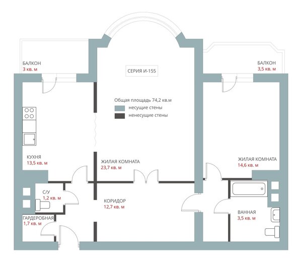 Для семьи с двумя детьми можно обойтись без перепланировки. Для этого гостиную обустроим на кухне. 14 квадратных метров достаточно для установки линейного гарнитура и диванчика. Правда, выход в смешную комнату придётся заложить. Теперь там будет детская, которую разделим надвое текстильной перегородкой. Спальня с мастер-ванной останется на своём месте, а коридор максимально используем для размещения систем хранения.