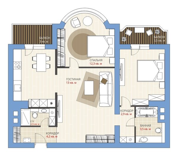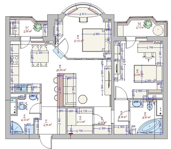 Вполне законно можно перенесли кухню на нежилую площадь – в коридор. Зону готовки визуально отделяет барная стойка. Совсем рядом окажется гостиная с парой диванов и столовая с большим овальным столом в эркере. На месте кухни обустроим детскую. Вход в спальню перенесём, а уже из неё можно будет попасть в мастер-ванную, которая максимально расширена за счёт коридора. Шести квадратных метров хватит даже для джакузи.