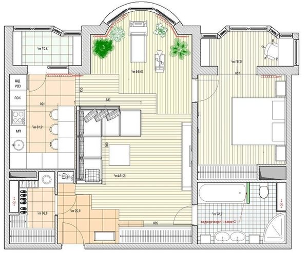 Если квартира расположена на первом этаже или над нежилыми помещениями, можно перенесли кухню через стенку – прямо в гостиную. Здесь же обустроим столовую. Это позволит обустроить полноценную вторую спальню. Если проект дома позволяет, можно перенесли дверной проём в несущей стене, чтобы расширить ванную при основной спальне за счёт коридора. А в холла останется место для кабинета – его даже можно закрыть стеклянной перегородкой.