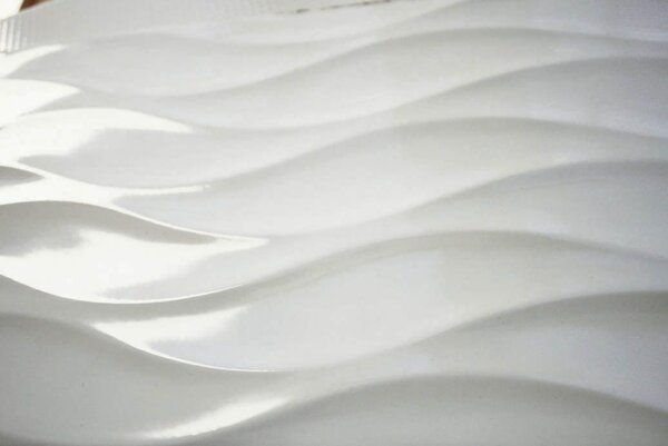 Кухонный фартук стал ярким акцентом. Он выполнен из стильной волнистой плитки крупного формата, которая добавляет интерьеру динамики и современности. Подобные коллекции можно найти, например, у производителя Cersanit.