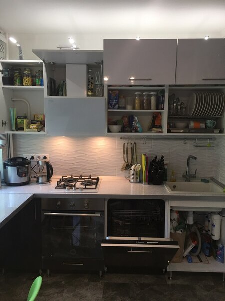 Особое внимание уделено свету. Под верхними шкафами установлены точечные светильники, которые создают идеальное освещение для рабочей поверхности.