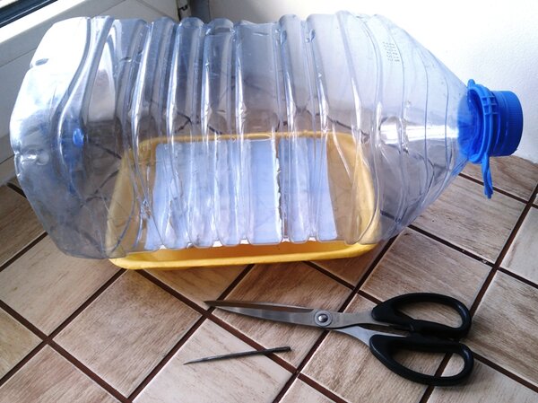 Вместительную компактную тепличку для посева семян легко сделать из 5 литровой пластиковой бутылки квадратной формы. Процесс изготовления теплички занимает 5 минут. Потребуется нож или ножницы, шило, маркер, скотч, а также поддон для теплички.