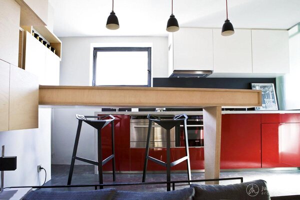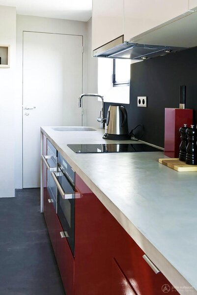Кухонный гарнитур – главный акцент серо-белой студии. Он насыщенно-красный, потому что всё время находится на виду и призван привлекать к себе внимание.