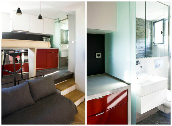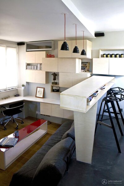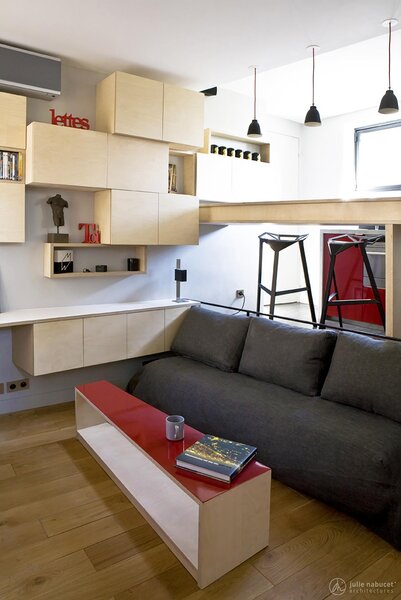 Своё первое жильё молодой человек решил сделать минималистичным и современным. При этой найти место для кровати или изолировать спальню оказалось не так-то просто. Поэтому архитекторы студии Nabucet придумали поднять кухню на подиум и в нём спрятать диван-кровать с ортопедическим основанием и матрасом.