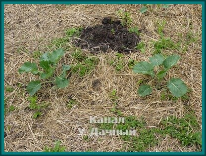 Проделала я в этой дернине отверстия, компоста положила и посадила рассаду капусты. Рассада прижилась и в рост пошла. Тогда, я решила, что вокруг посаженных растений, надо почву травой скошенной заложить. Задумала – сделала. Получилось, что-то типа мульчи. Даже красиво.