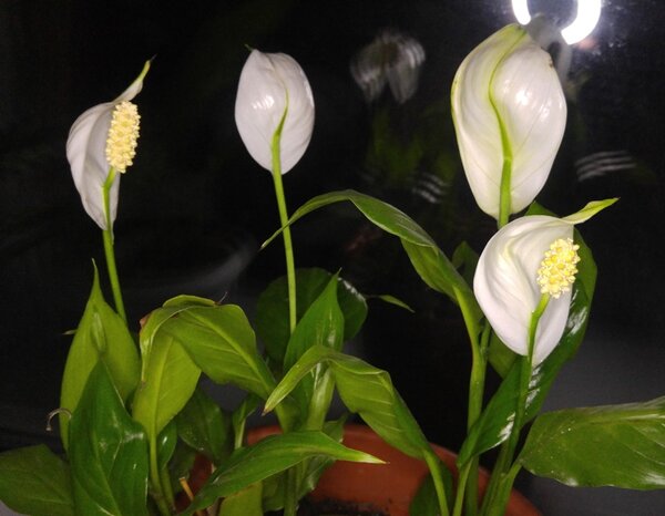 2. Через месяц спатифиллум переставьте на светлый подоконник с восточным или западным направлением в тёплую комнату, начните поливать и опрыскивать цветок регулярно, также полезно внести фосфорно-калийное удобрение или любой состав для цветущих растений. После смены неблагоприятных условий на хорошие «Женское счастье» начинает выпускать новые цветоносы примерно через месяц.