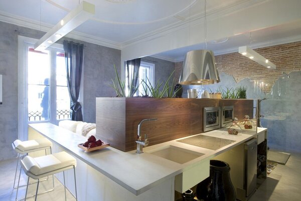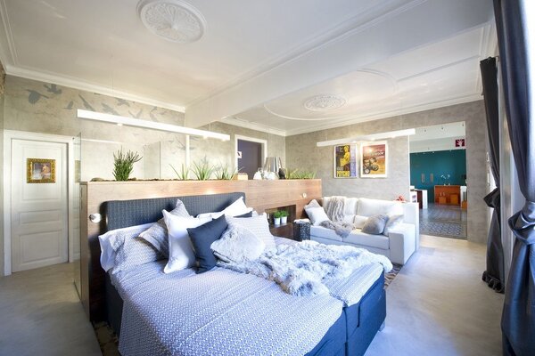 В оформлении интерьера сочетали бетон и старую кирпичную краску, белые матовые поверхности и лепные розетки на потолке. Всю мебель сделали на заказ. Она словно разделяет квартиру на зоны. Например, кухонная столешница перетекает в барную стойку за диваном, напротив него – двуспальная кровать и телевизор.