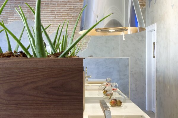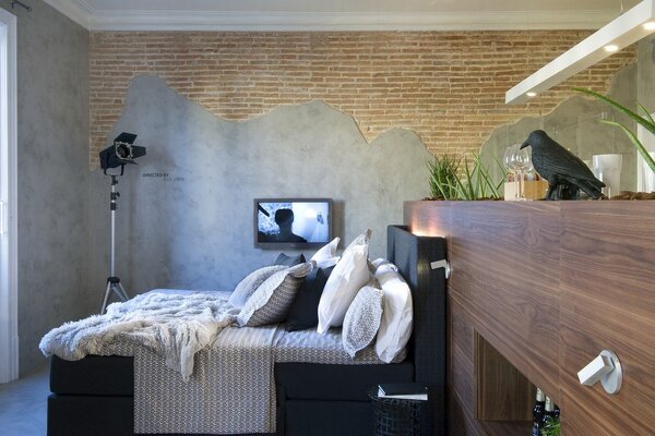 Создатели отеля в Барселоне задались целью на 35 кв. м уместить весь необходимый функционал. В центре они установили низкий шкаф, от которого в разные стороны расходится мебель и даже… туалет за стеклом!