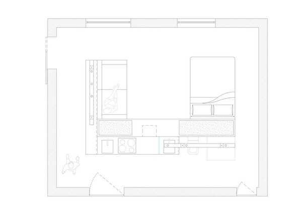 Вдоль стен осталось достаточно свободного места, чтобы легко перемещаться по комнате. А единый потолок делает её визуально просторней. Функции зонирования служит ещё и освещение, которое свисает с потолка.