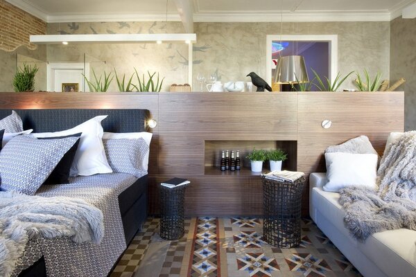 Даже декор в этом отельном номере нестандартный. Так верхнюю часть шкафа-перегородки превратили в цветочные горшки для алоэ, а стены украсили постерами из картин Хичкока.