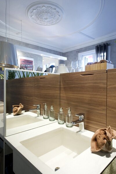Зону кухни и санузла разделяет небольшая зеркальная перегородка возле умывальника. Но и она практически не скрывает то, что в обычных квартирах принято прятать.