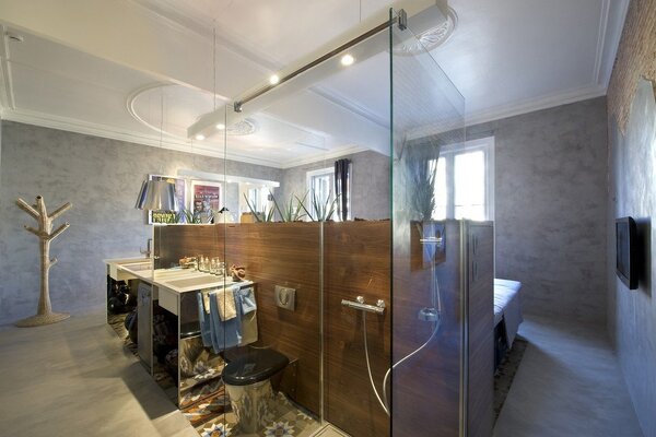 И туалет, и душевая кабина отгорожены от основной части комнаты лишь стеклянными перегородками. Проект продуман с технической точки зрения, чтобы обеспечить удаление неприятных запахов и излишней влаги. Но всё равно на подобное решение может решиться разве что очень смелый холостяк.