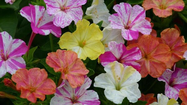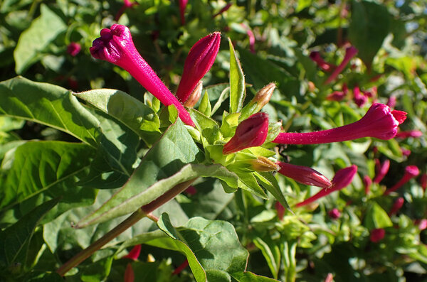 Листва у мирабилиса среднего размера, нежно-зеленого оттенка. Цветки по форме напоминают изящную воронку с узкой длинной трубкой. Палитра окрасок невероятно богата: от белоснежной и желтой до розовой, малиновой, пурпурной и даже двухцветной. Интересно, что на одном растении могут одновременно распускаться цветки разных оттенков, а некоторые сорта украшены мраморным или полосатым рисунком. Цветение начинается в июне и продолжается до первых осенних заморозков.