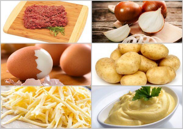 - выложить слой лука на котлетку - лепешку, затем слой яиц, картофель, тертый сыр, полить соусом (рецепт в ингредиентах) из расчета примерно 1 ст.л. на 1 котлетку