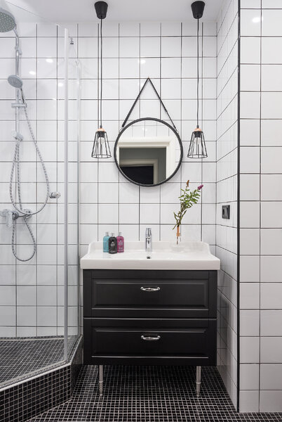Санузел совместили, чтобы выиграть хотя бы немного ценных сантиметров. А чтобы он визуально казался просторней, дизайнер сочетала обычную белую квадратную плитку на стенах с мелкой чёрной мозаикой на полу.
