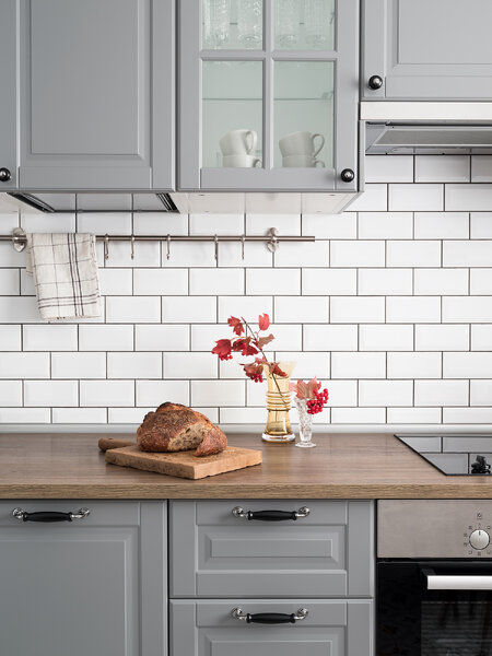 Этот благородный цвет контрастирует с нейтральными серыми фасадами – классическими, с филёнкой и стеклом. Линейный гарнитур и деревянную столешницу из массива подобрали в масс-маркете.