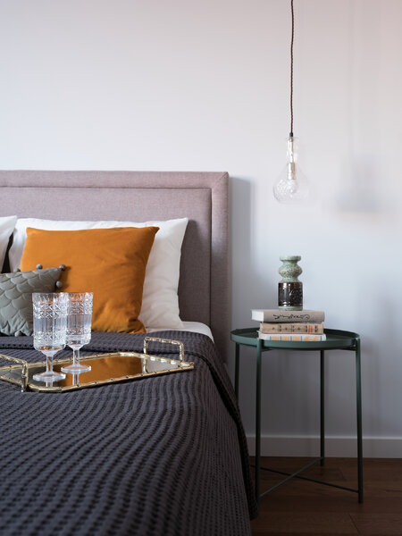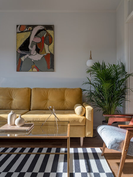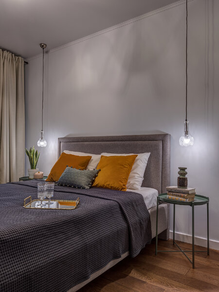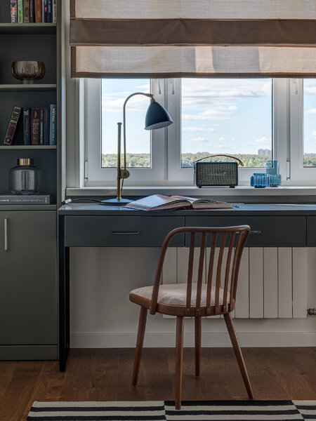 Квартиру в «брежневской панельке» оформляли для сдачи в аренду, но избавляться от старой мебели не стали. Она была дорога хозяевам как память о молодых годах, которые прошли в этих стенах. Поэтому дизайнер Александра Рассказова создала нейтральный современный интерьер, смешав классику, mid-century и скандинавский стиль.