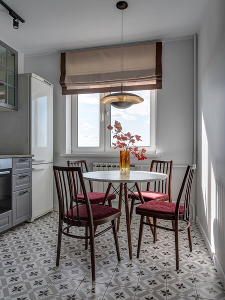 На кухне для обеденной группы подобрали стол, похожий на Eames. Он удачно подошёл к старым стульям, которые остаются в этой квартире с момента постройки дома – с 1983 года. Их обили бархатом винного оттенка.
