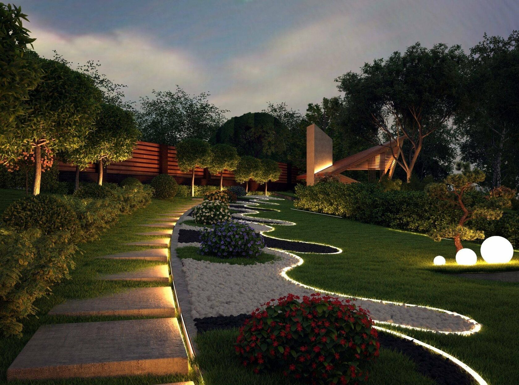 Дорожка, подсвеченная напольными светильниками в виде садовых фигур