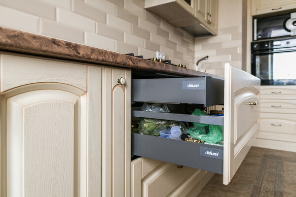 Организация хранения продумана до мелочей. Например, в верхнем уровне специального ящика удобно размещены столовые приборы, а под ним найдётся место для более крупной кухонной утвари.