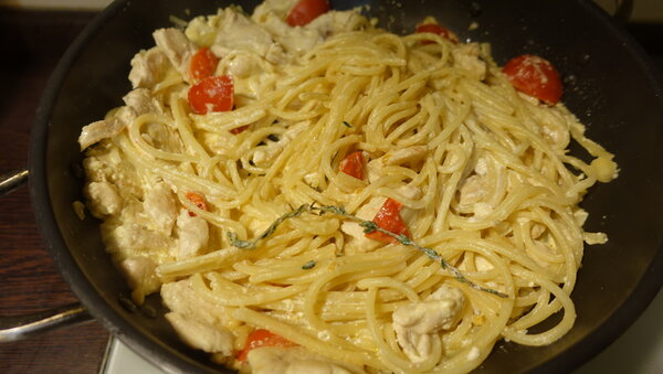 "Паста с курицей в сливочном соусе с миндалем и кедровыми орешками"