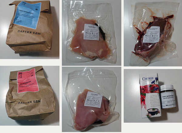 В аккуратной картонной коробке мы обнаружили три пакета с ингредиентами, разделенными на ужины, термопакет с мясом, сливками и соусом демиглас, а также инструкции по приготовлению и спец-предложения.