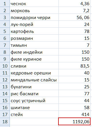 Получилась пугающая цена, потому что лук-порей не продается кусочками, тимьян и розмарин веточками, с орешками, картошкой и другими продуктами все обстоит похоже.