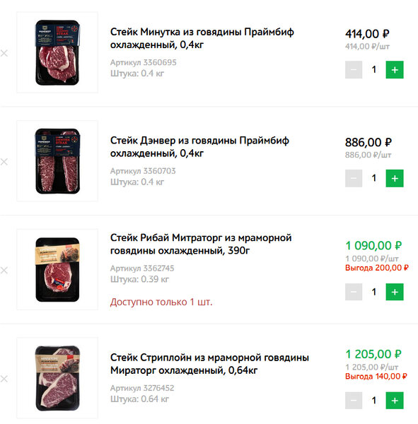 Есть еще один нюанс. Я при расчете выбрала дешевые стейки (в поставке говядина была свежей и приятной, но точно не мраморной):