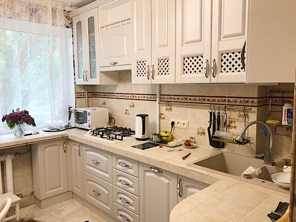 С момента завершения проекта прошло два года. По отзывам хозяев, кухня и плиточная столешница отлично себя зарекомендовали, не доставляя хлопот в эксплуатации.