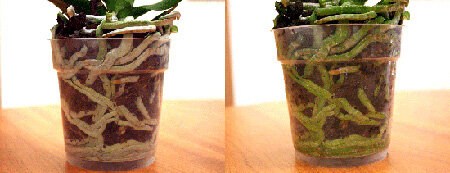 1. Цвет корней. Влажные корни, просвечивающие через стенки горшка, имеют ярко-зеленый цвет. Если они стали серебристо-серыми — это сигнал к поливу. Зеленые корни означают, что с увлажнением можно подождать 4-5 дней.