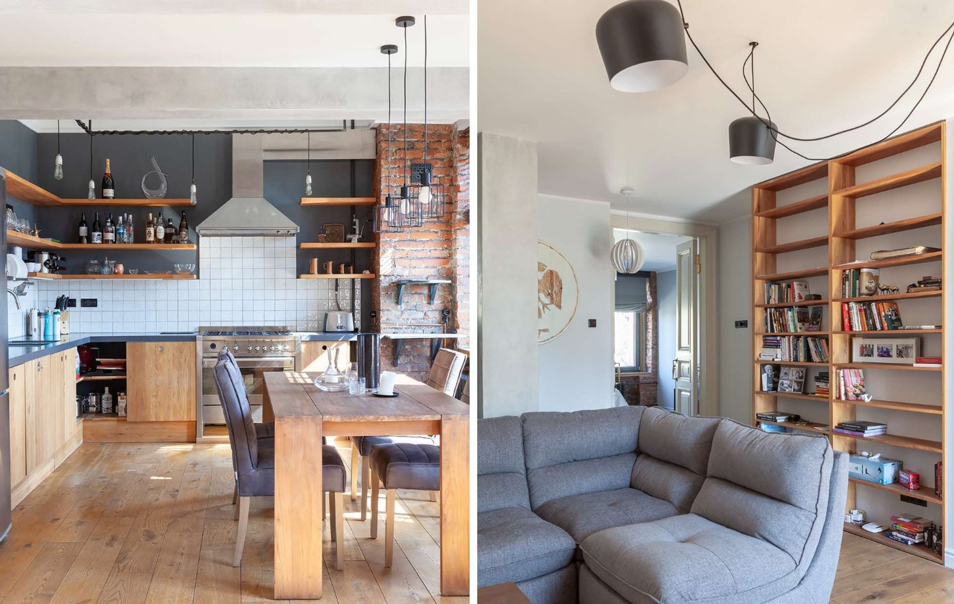 Заказчик, молодой холостяк, хотел получить интерьер в стиле лофт, но при этом избежать излишней грубости и брутальности, характерных для этого направления. Дизайнер нашла элегантное решение, взяв за основу светлую, спокойную цветовую гамму и разбавив индустриальные элементы классическими деталями. Например, в гостиной появились стёганый диван и кресло, которые смягчают общее впечатление.