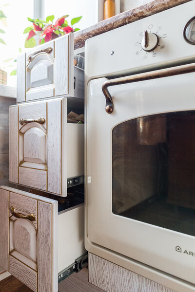 Для гарнитура была выбрана надежная, но не самая дорогая фурнитура — без систем плавного закрывания (доводчиков), но с амортизаторами для мягкого и тихого хода.
