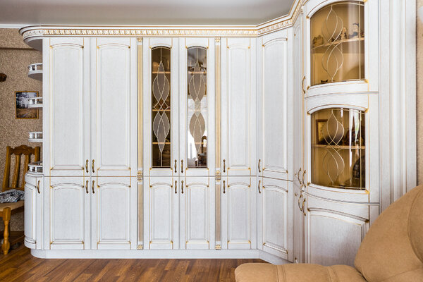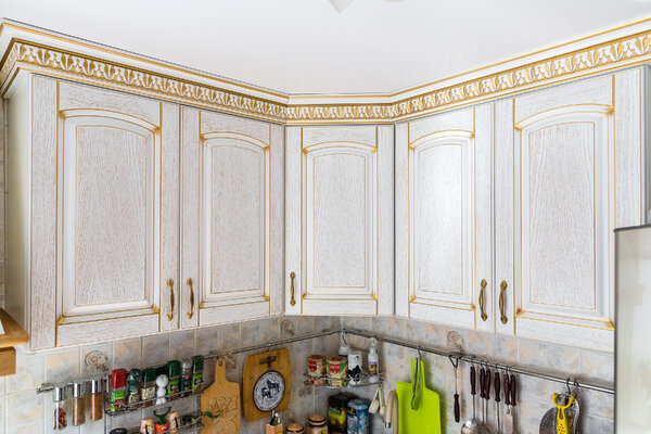 Фасады изготовлены из МДФ и декорированы шпоном с последующей окраской в белый цвет и нанесением изысканной золотой патины, которая придает благородный винтажный вид.