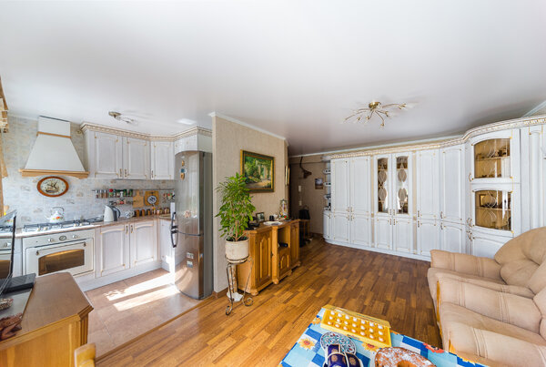 Панорамный вид на объединенное пространство кухни и гостиной.