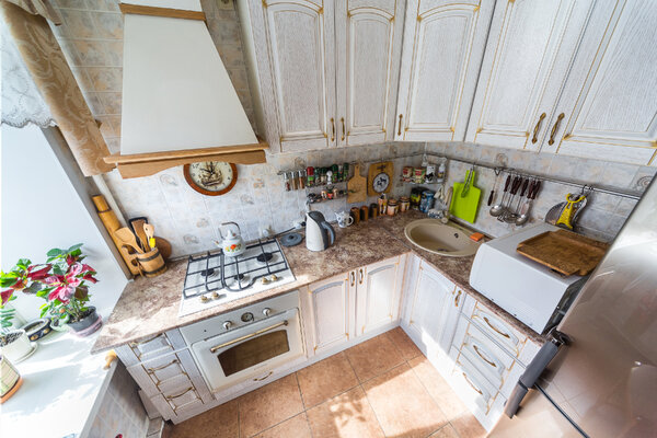 Ремонт в квартире был косметическим, так как капитальный уже проводился несколькими годами ранее. Поэтому существующую плитку на фартуке и полу, а также рейлинги решили оставить.
